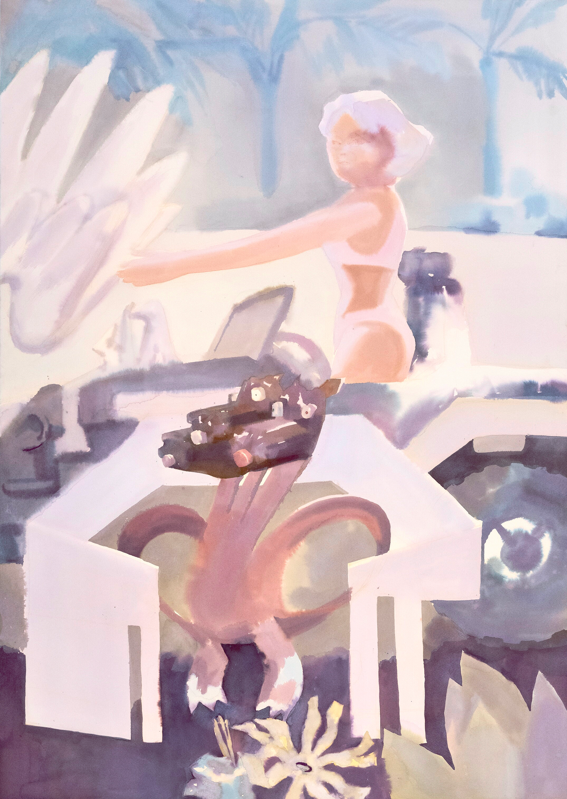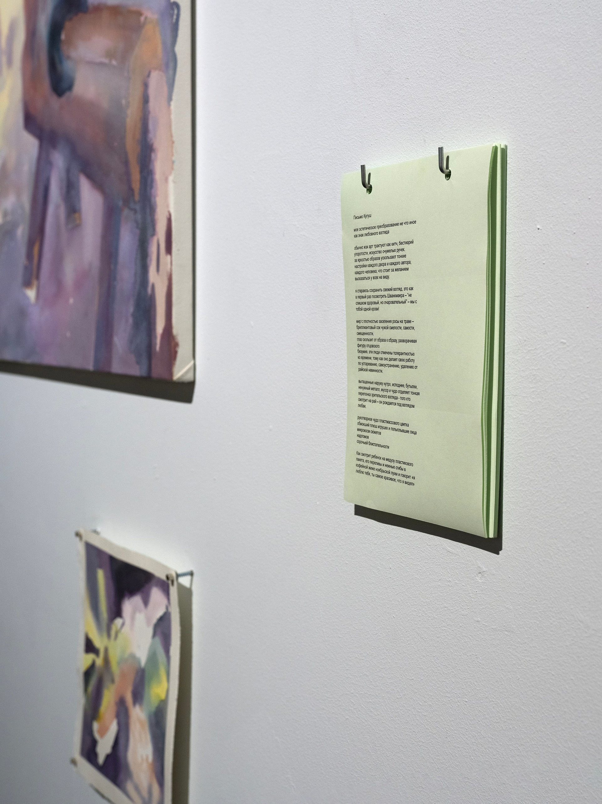 В выставочном проекте персонажи, цвета и сюжеты конкретных дворов переплавлены художницей в разномасштабную акварельную графику — визуальный дневник коллективного фантазма.